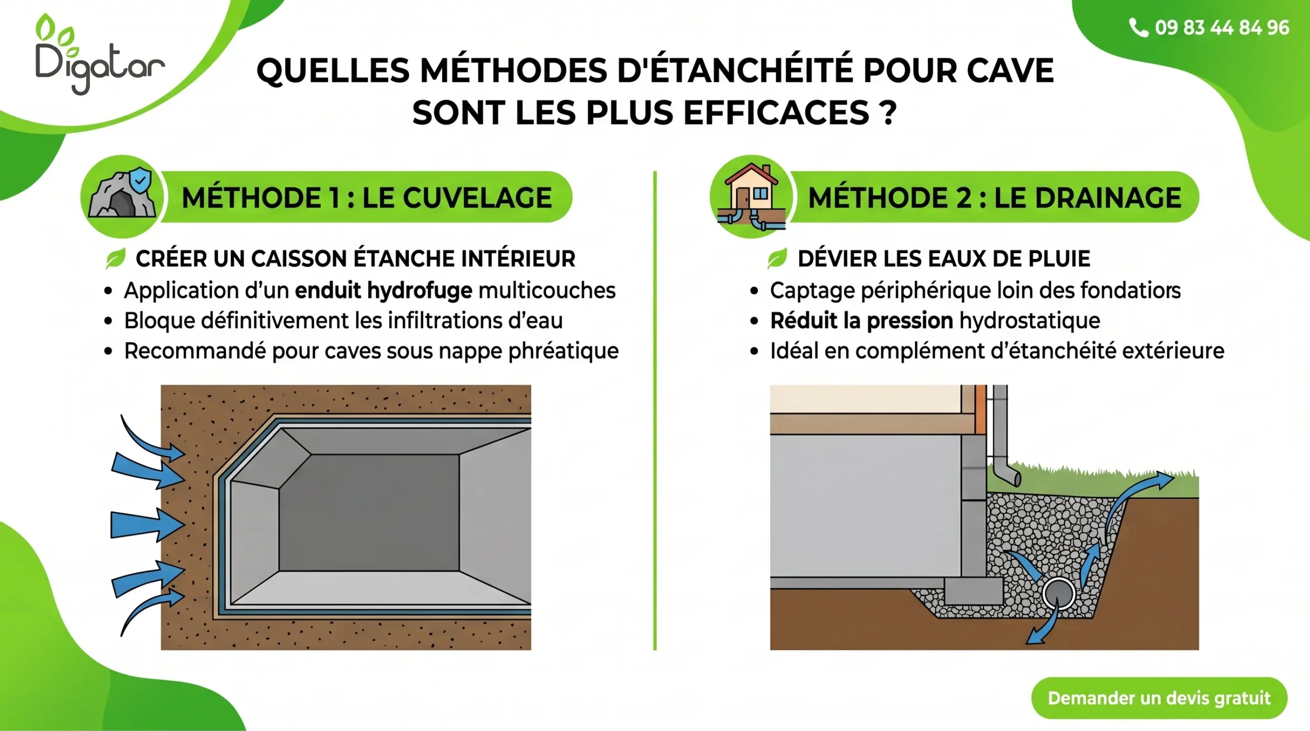 L’efficacité repose sur un diagnostic précis suivi d’une solution adaptée : cuvelage pour la pression, résine pour les sols, ou drainage pour les eaux extérieures. Demandez un diagnostic humidité pour évaluer votre situation.